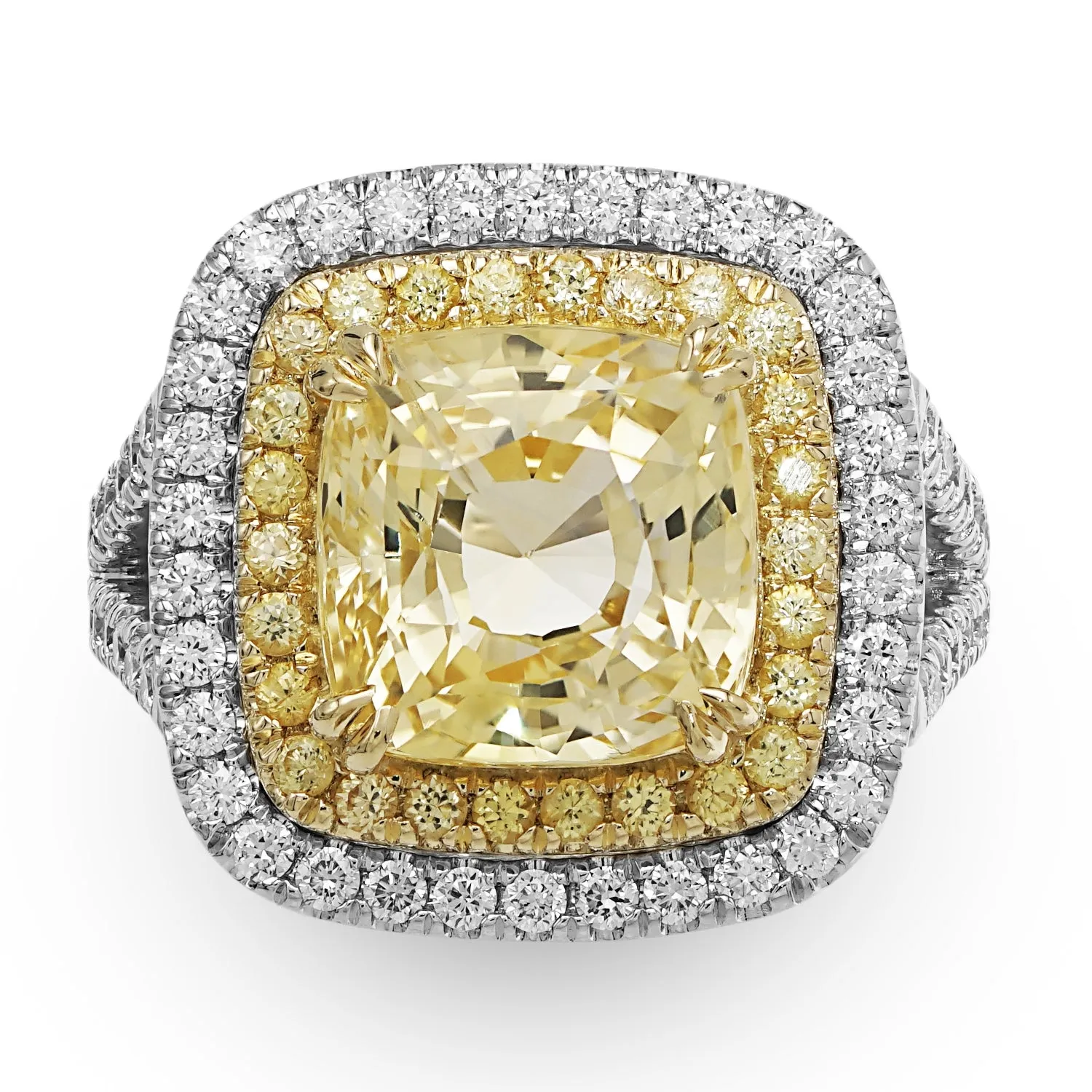 Cushion-cut unheated yellow sapphire haloed by melee diamonds and yellow sapphires set in an 18kt white gold ring.