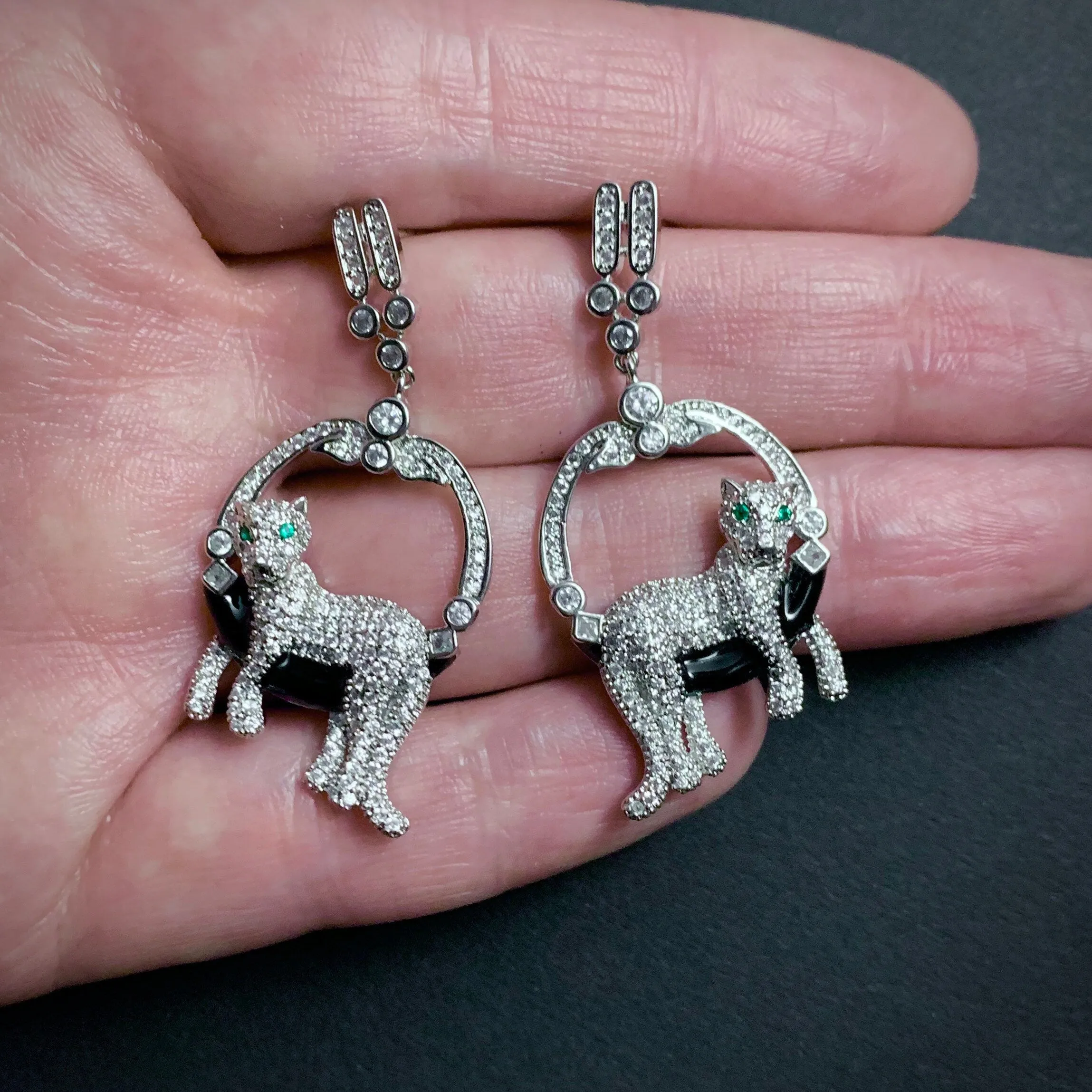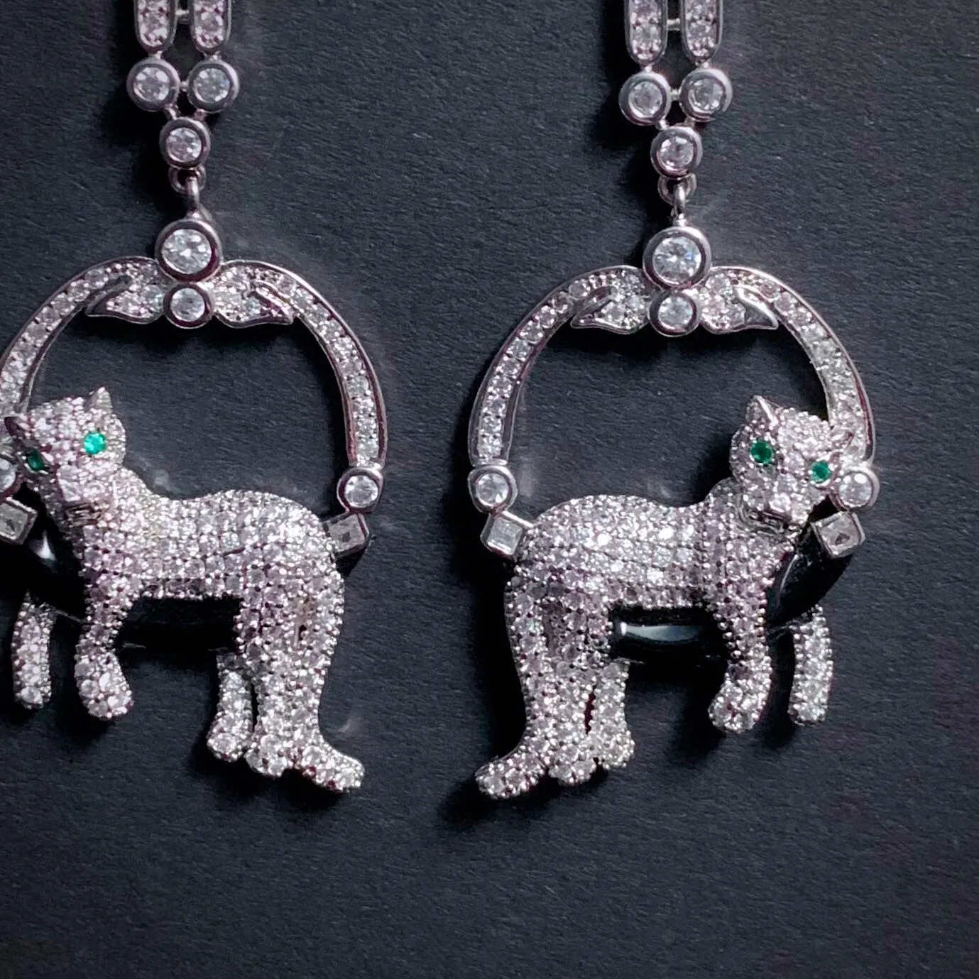 Exquisite Old Hollywood style earrings featuring two very cool cats with gleaming emerald green eyes. The earrings have a rhodium plating and are encrusted with loads of twinkling cubic zirconias and a shiny black enameling underneath the leopards.