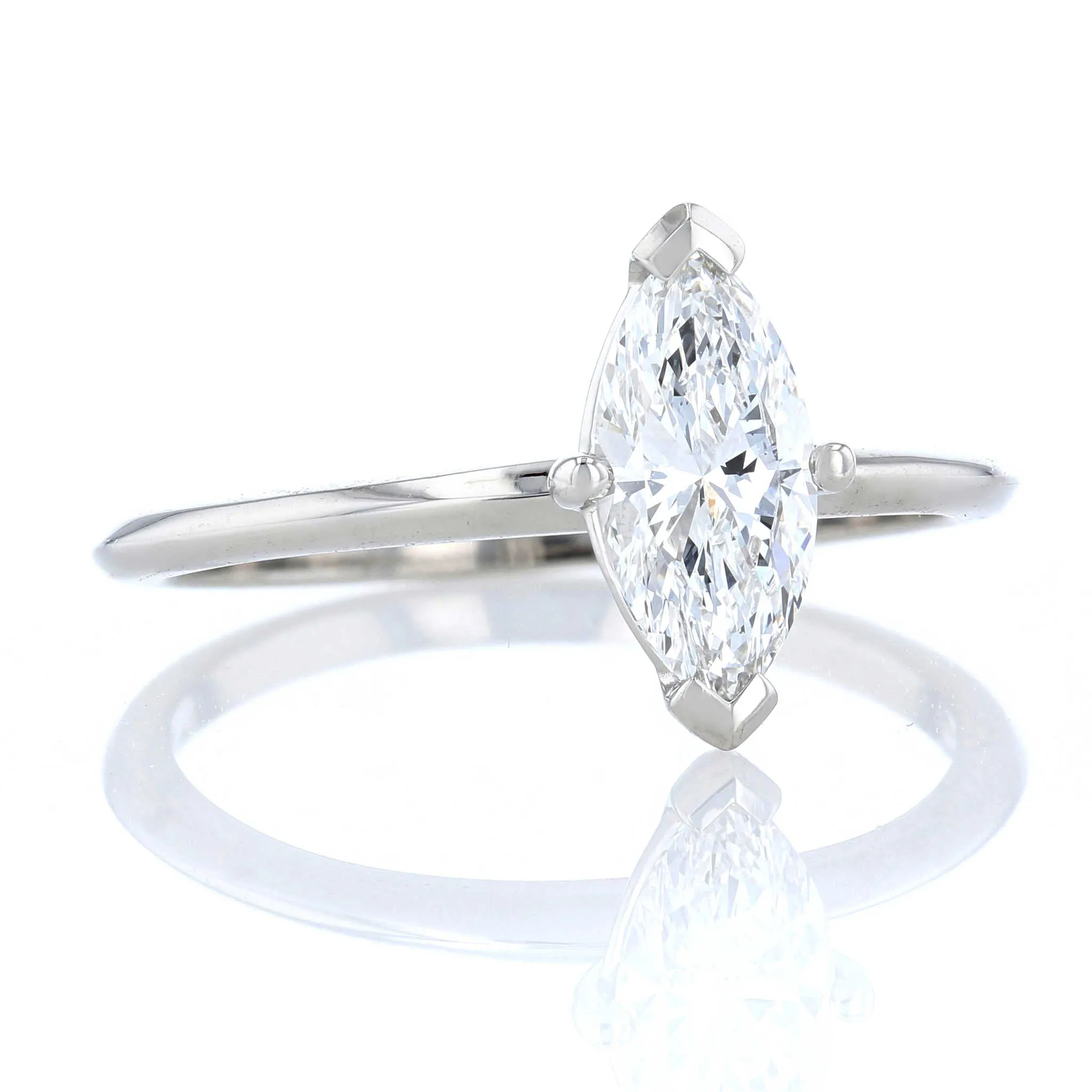 Simple and stunning, solitaire rings are always in style. A marquise diamond sits atop a gleaming band of platinum.