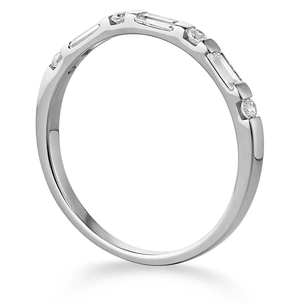 A playful combination of ice white baguette-cut and round brilliant Tru-Diamonds™ lend the Simple Devotion Ring a unique and contemporary sparkle. This ring brings elegance through simplicity to its wearer.