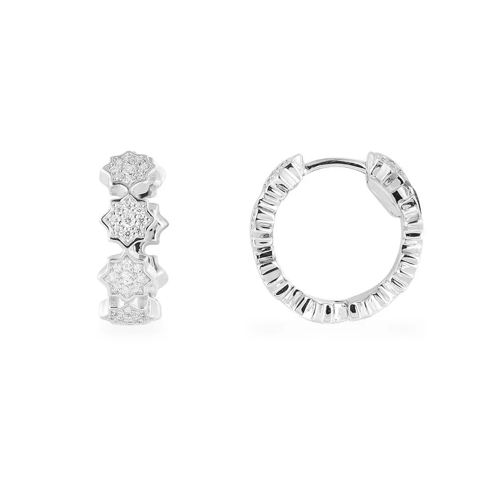 These earrings are handcrafted from sterling silver and micro paved with white zirconia stones. In a hoop shape, they are designed with 8 eight pointed stars.